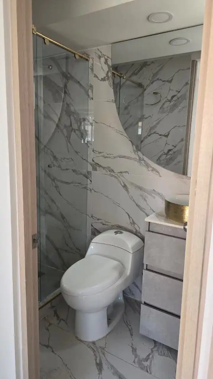1 habitación principal con amplio clóset 1 habitación secundaria 1 baño con acabados modernos Sala con elegante barra en mármol Cocina integral con extractor táctil y estufa táctil Zona de lavandería independiente, separada con puerta en vidrio Calentador a gas.
