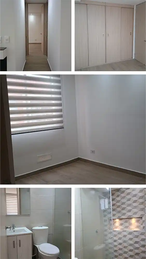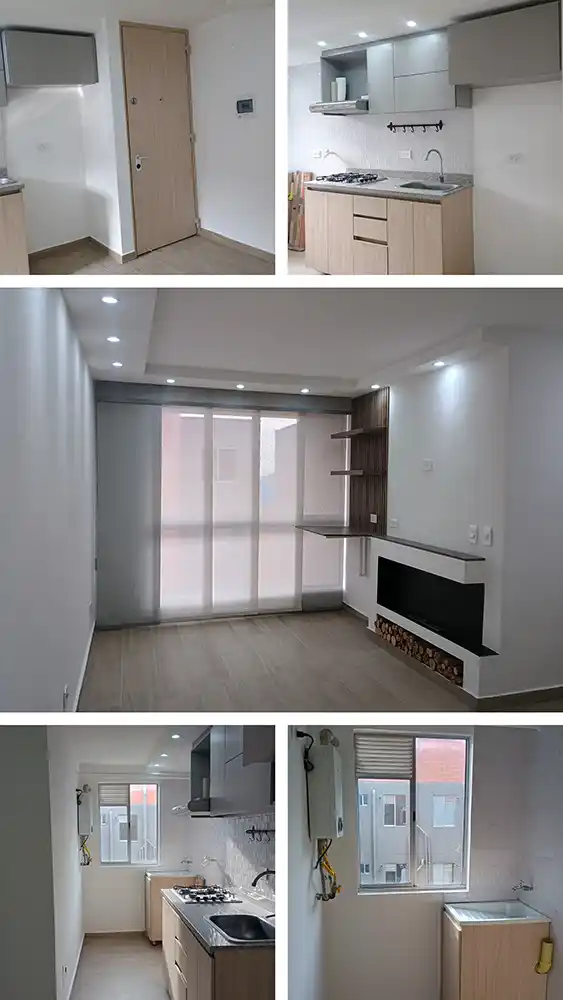 Área construida 40 M2, 2 Alcobas, 1 Baño, Sala comedor, Cocina y Zona de lavandería con ventilación natural. Calentador a gas marca Bosch, puerta de seguridad del nivel superior, chimenea de bioetanol, en sala cortinas en panel tipo japonés y en habitaciones cortinas tipo persiana con blackout, closets amplios en cada habitación. Último piso (7) con ascensor.